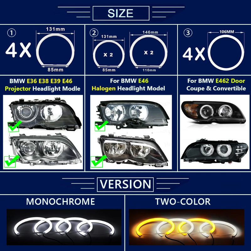 AkiHalo 4pcs COB Cotton Angel Eyes Halo Ring for X5 BMW E36 E39 E38 E46 Non-projector Headlight DRL